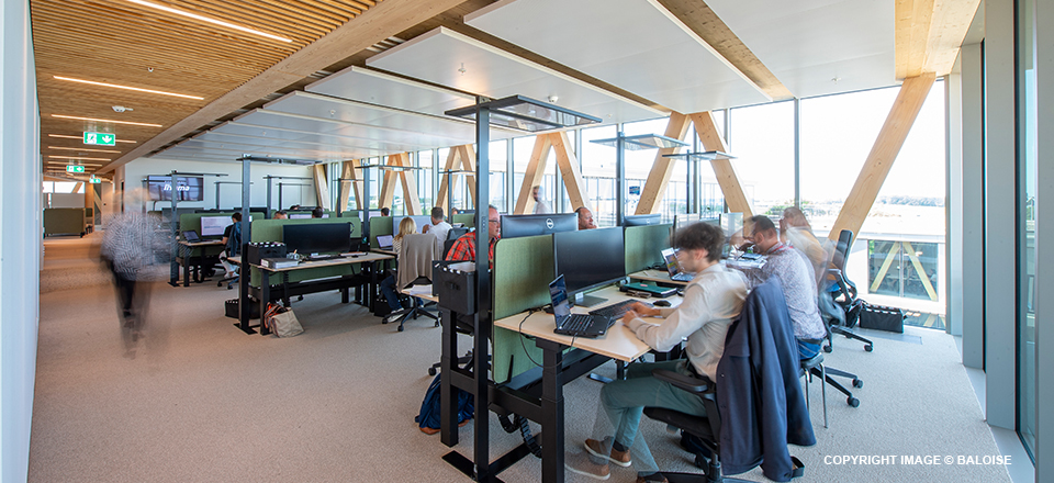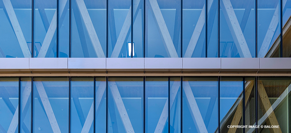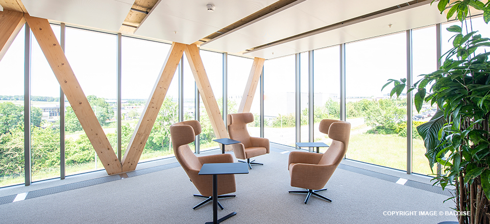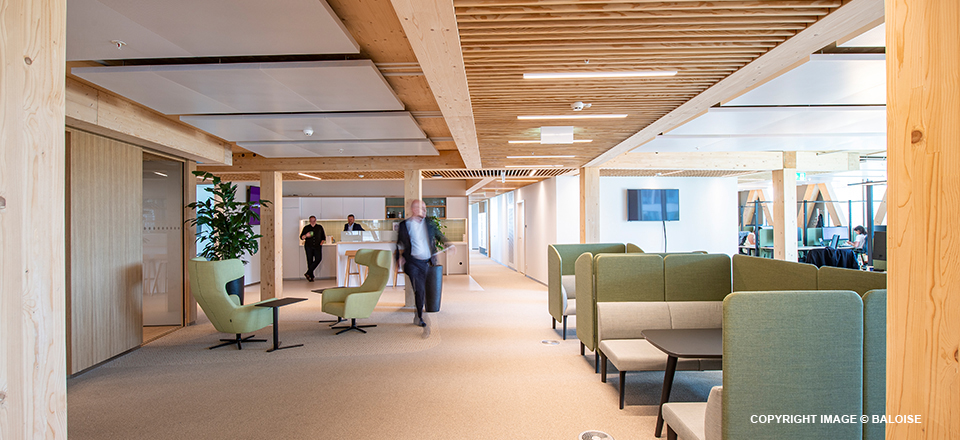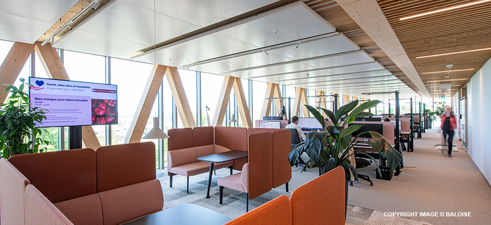 Baloise Assurances y a installé son siège social, témoin de son engagement sociétal. Les aménagements intérieurs transcendent les qualités de l'architecture, alternant lieux d'interaction, de concentration et d'immersion dans un tout homogène et bienveillant.