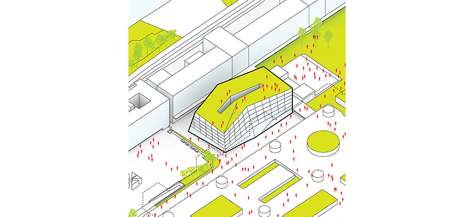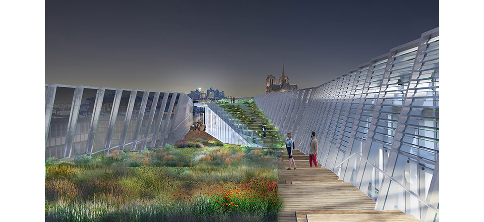 Nous proposons un bâtiment qui se mue en parc. La gorge centrale fusionne le parc et la place de l’IMA (Institut du Monde Arabe) suivant l’intention initiale, apparaissant sur le plan directeur, de procurer un axe vert. La surface empreinte au sol de l’immeuble est redonnée sur le toit, au travers d’une grande terrasse. Elle offre deux espaces extérieurs couverts pour le restaurant, une pente douce et verte permettant aux vues de se fondre sur le panorama de la ville. |