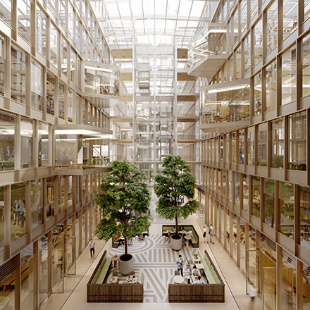 Ainsi, le bâtiment a été allégé de masses bâties superflues pour accueillir un atrium monumental, point focal abritant les flux verticaux. Les cours et patios sont agrandis et les façades largement vitrées inondent le bâtiment de lumière.