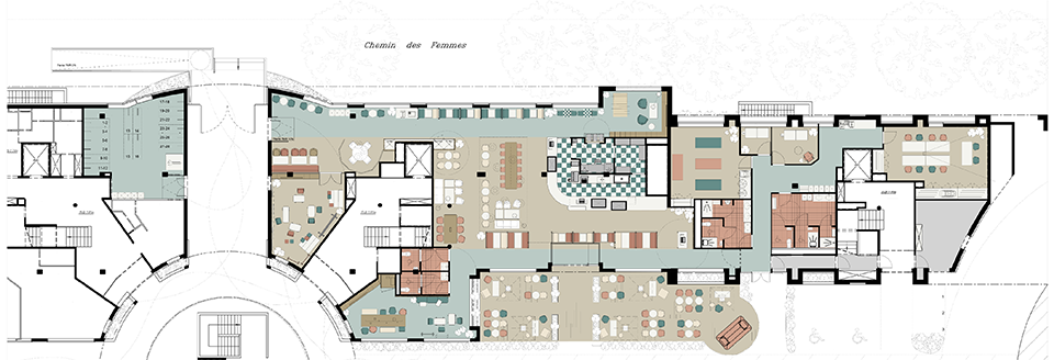 Le travail sur les espaces intérieurs a permis de transformer un ancien restaurant d’entreprise conventionnel en lieu de vie hybride, convivial et réversible, proposant les services appréciés des utilisateurs : restaurant, espace détente, salle fitness, espace Welness, coworking ainsi qu’une zone de mobilité douce. Ce projet de refonte des espaces techniques (cuisines, laverie, etc..) a abouti à une offre de services diversifiée et attractive alliant tous les codes de l'hôtellerie.