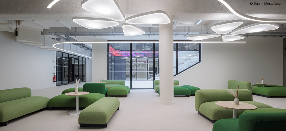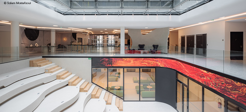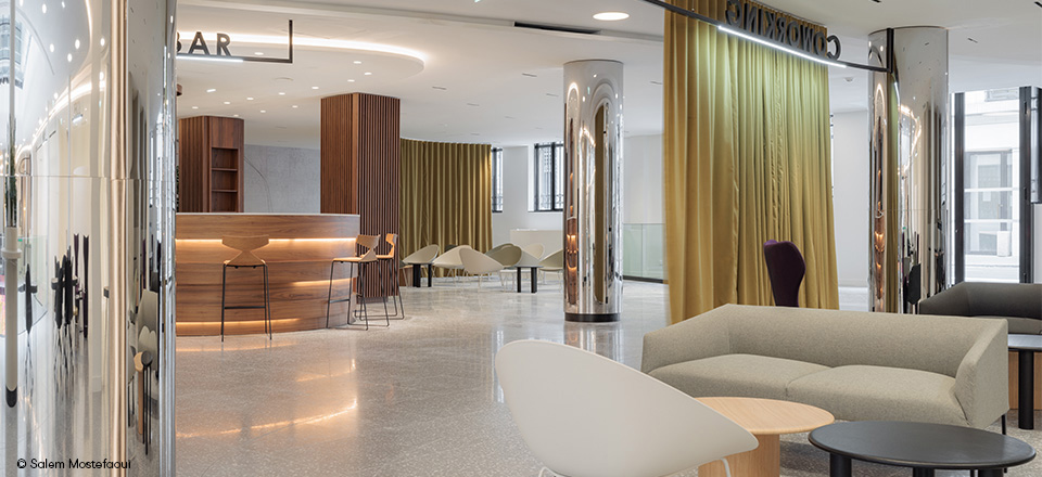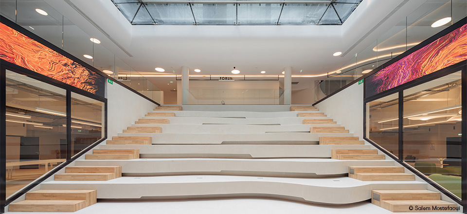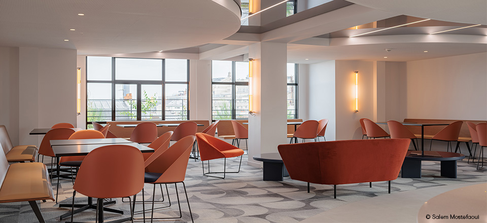 En contrepoint de la rigueur fonctionnelle de l’existant, la nouvelle restructuration vient apporter des synergies et faire coexister le mouvement et la sérénité, l’action et la réflexion, l’échange et la concentration. Ouvert sur la rue, le bâtiment s’ancre dans le quartier et offre des transparences saisissantes entre la rue de Châteaudun et la rue Saint-Lazare. La lumière, désormais omniprésente, constitue le fil d’Ariane guidant la fluidité des espaces et des circulations et glissant sur des surfaces aux teintes douces et aux textures naturelles.