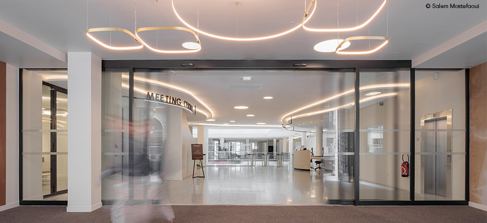 Le projet de 16 320 m² modernise les espaces intérieurs pour les enraciner dans le XXIe siècle et ses nouveaux usages : coworking, workcafé, foyer, salle polyvalente, forums intérieurs et extérieurs. Des espaces créés collaboratifs et réversibles, privilégiant le confort des utilisateurs. Les patios, toits-terrasses et nouveaux plateaux de bureaux incitent au passage et à l’échange. Les nouvelles mobilités sont valorisées avec la création de deux espaces vélo avec vestiaires, extension naturelle du mouvement urbain, afin de favoriser ce mode de transport auprès des usagers du bâtiment.