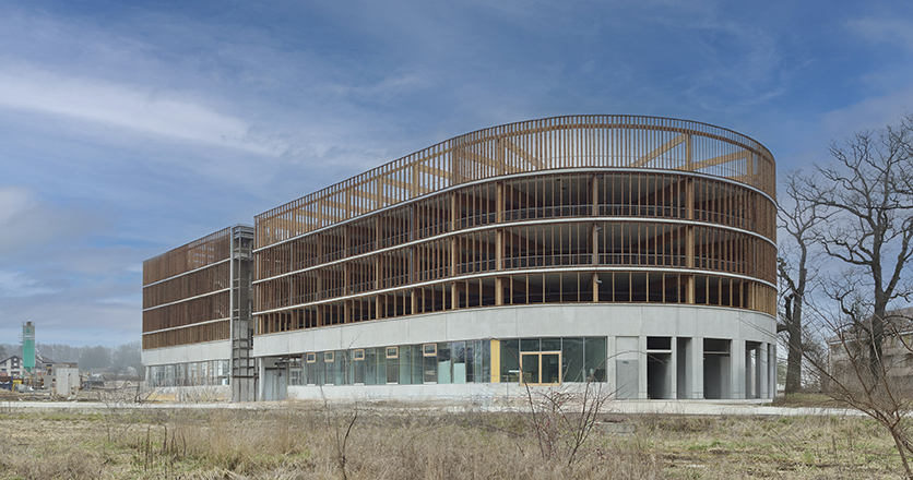 Concédant de la ZAC Ferney-Genève Innovation : Pays de Gex agglo (01) Maître d’ouvrage : SPL Terrinnov Architecte : AIA Life Designers Entreprise mandataire : Construction Floriot Ingénierie TCE + Economie : AIA Ingénierie Expertise environnementale : AIA Environnement Mission : Conception - réalisation Programme : Parc de stationnement de 450 places réversible en bureaux, hub entrepreneurial, centrale de production d’énergie, data center Surface : 14 384 m2 SDP, parcelle 5 774 m2