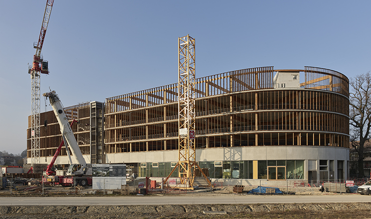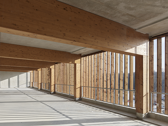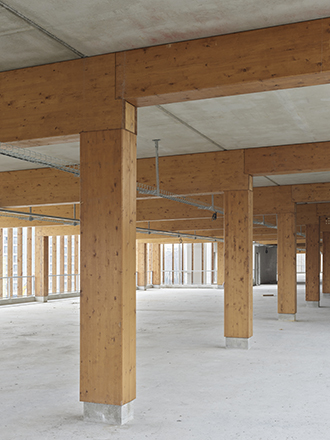- Les portiques de la structures bois-béton en arrière-plan, visibles à travers les façades, dessinent la silhouette “exo-squelette” du bâtiment et soulignent la légèreté et la technicité de l’ensemble.