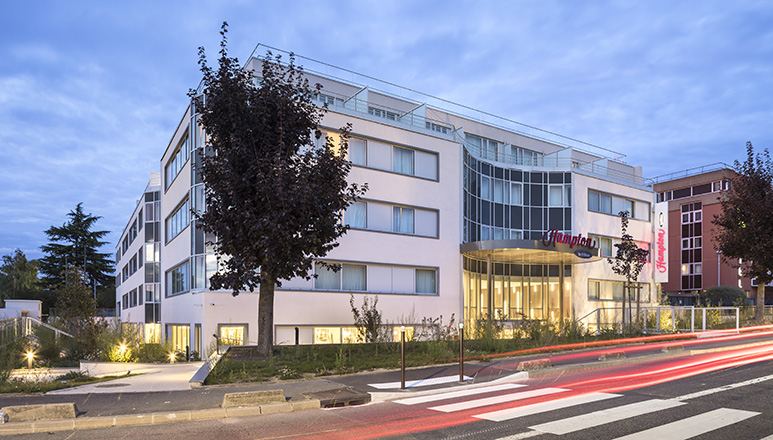 Fiche technique Maître d'ouvrage : Yoma Architecte : Atelier M3 (mission complète) Utilisateur : Hampton by Hilton Surface : 6 300 m2 Adresse : 2 avenue Heinz Gloor, 95700 Roissy-en-France