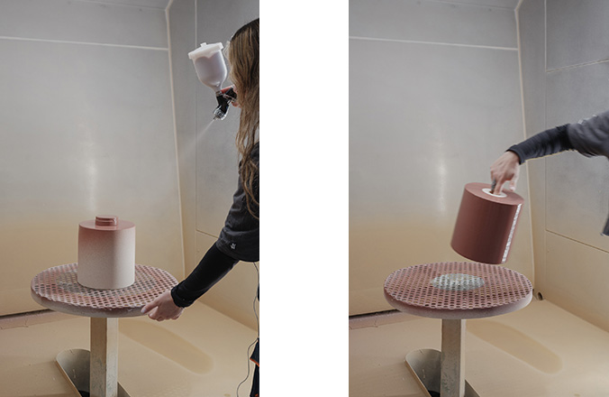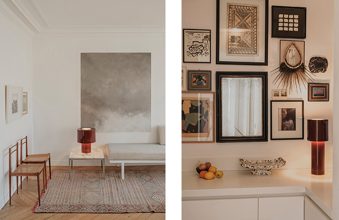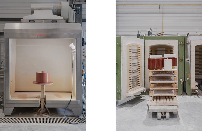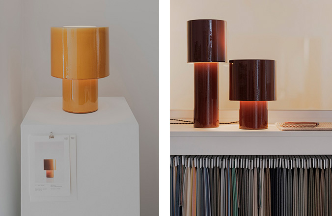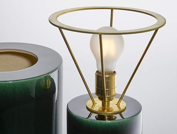 Chaque lampe est réalisée en grès coulé à la main, en petite série, dans une petite manufacture (en Indre-et-Loire) garantissant une finition unique. Le contraste subtil entre la matière brute intérieure et la surface extérieure émaillée en couleur, sublime la diffusion de la lumière, créant un jeu délicat d’ombres et d’éclats teintés.